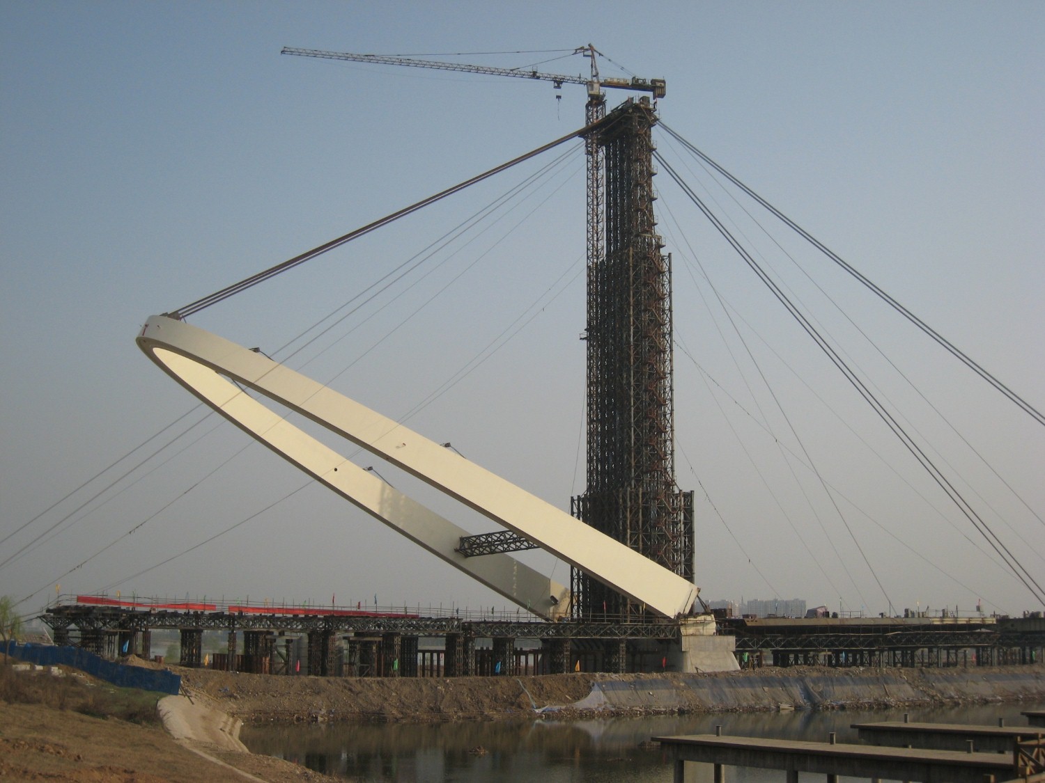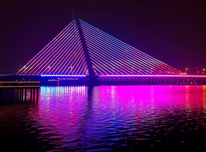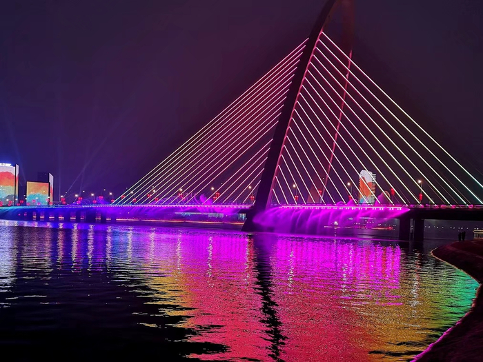 The bridge tower is designed as an inclined arch steel structure, with a total height of 78 meters and an inclination angle of 75 degrees, forming a striking architectural silhouette while ensuring excellent structural performance.