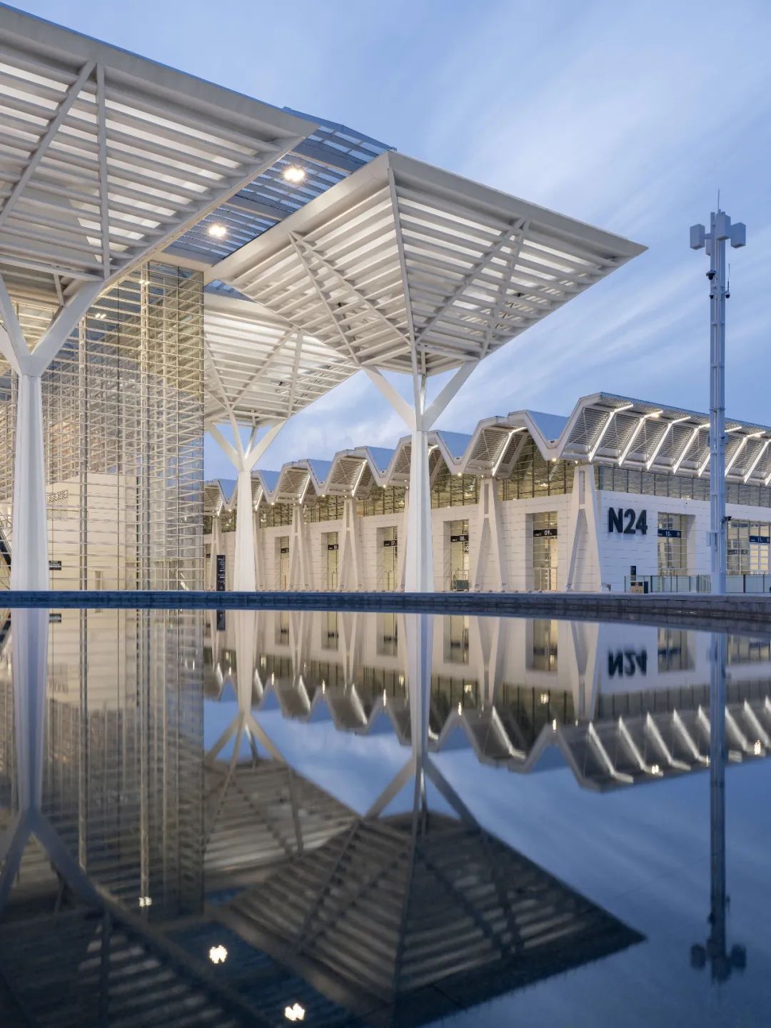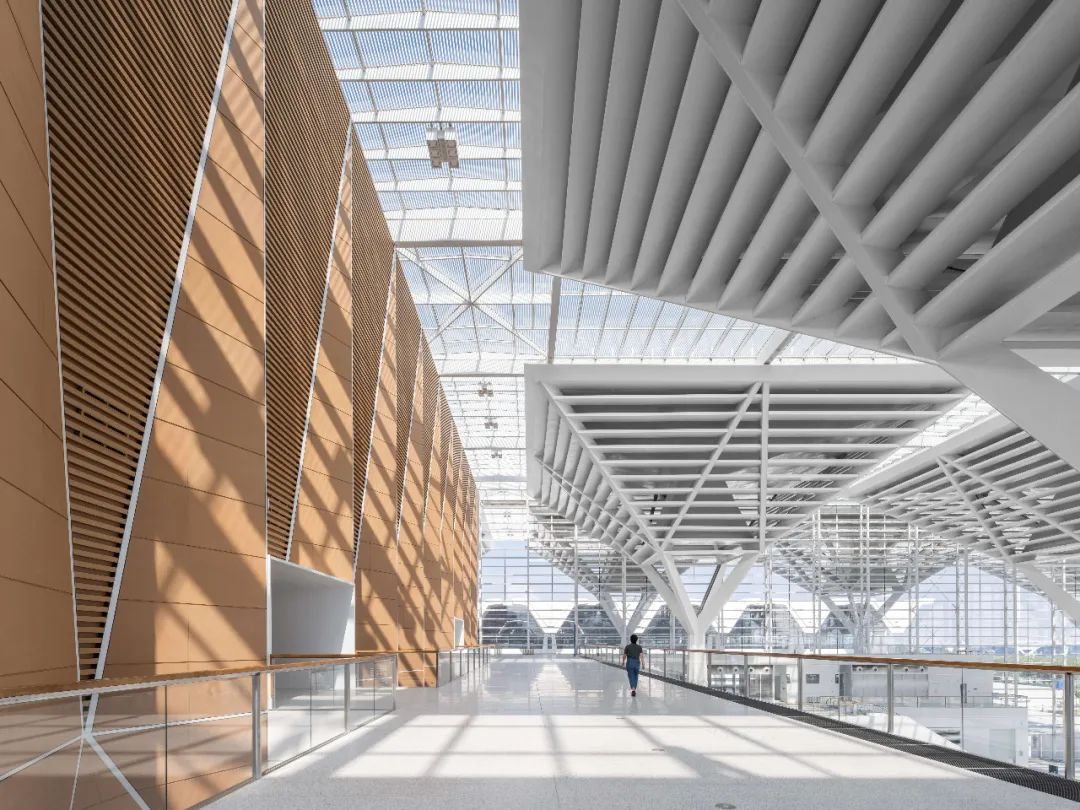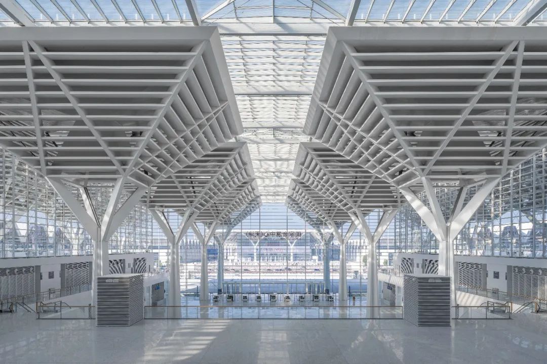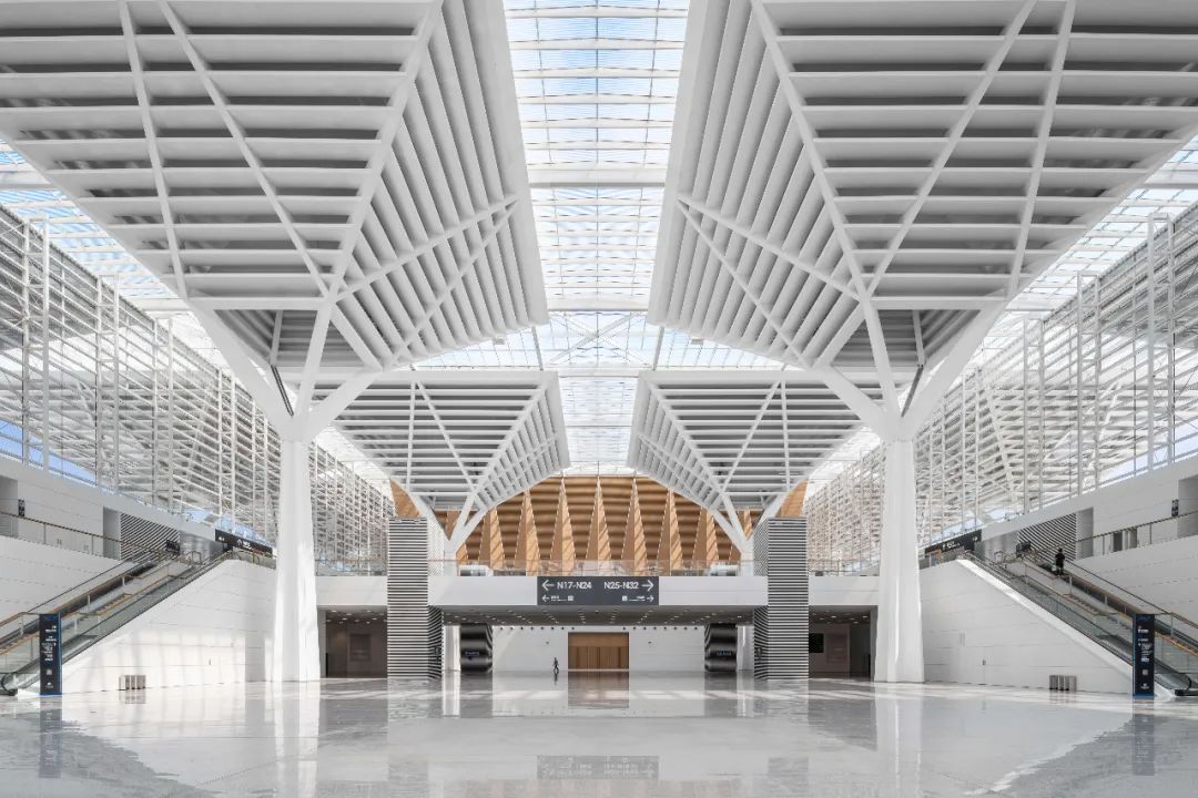 Central Hall – Supported by 32 large umbrella-shaped steel structures with a diameter of 30 meters and a height of 34 meters, connecting the north and south squares.
