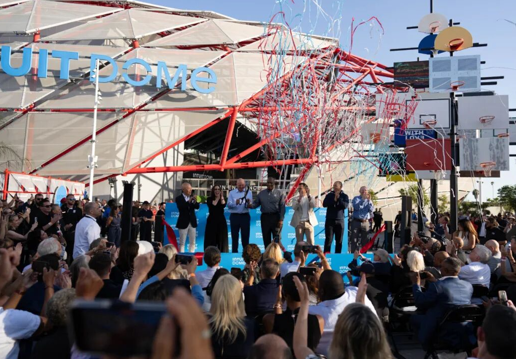 At the opening ceremony, Steve Ballmer, Chairman of the Los Angeles Clippers, and James Butts, Mayor of Inglewood, jointly cut the ribbon to celebrate the arena’s inauguration.