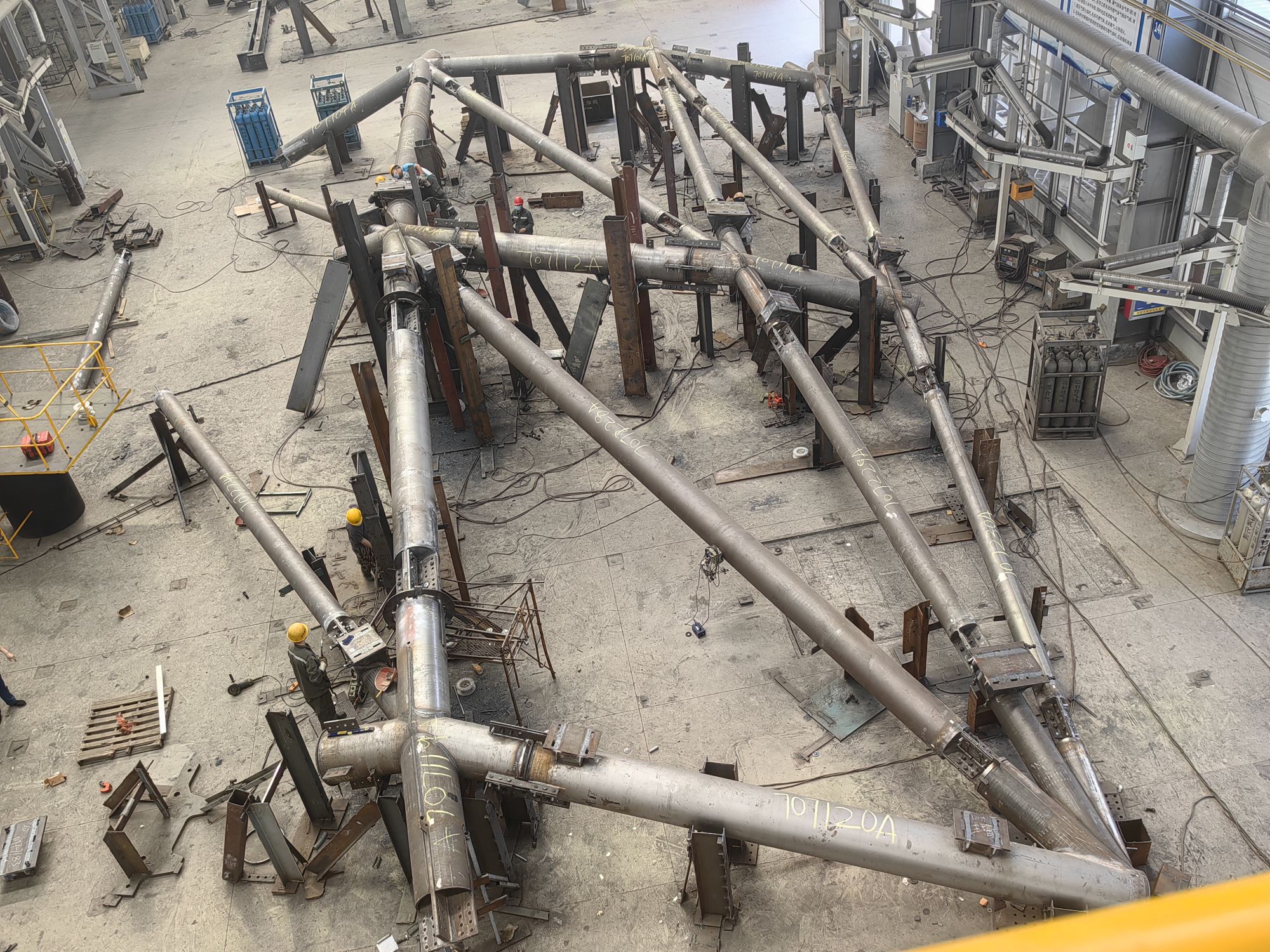 Material Procurement and Inspection As Jinhuan Steel Structure’s first AESS-exposed steel project, strict evaluation of suppliers was conducted, and selected steel pipes underwent additional machining to meet requirements. All incoming pipes and plates were rigorously inspected for roundness, wall thickness, and straightness.